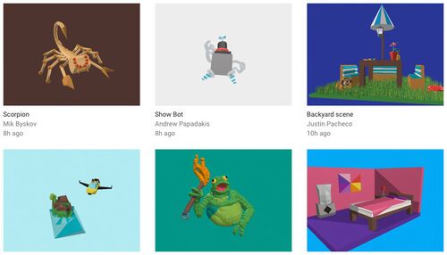 作った作品はWebで公開できる。https://vr.google.com/objects/ そこではモデルをobj, mtlの組でダウンロードできるので、ゲームに持っていくことは可能。球・立方体・トーラスなどの基本図形を配置して、頂点や面を移動させ、各オブジェクト毎に色を設定で…