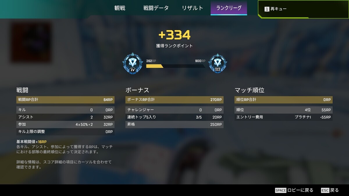 2022/01/30 I wanna add 100 RP every day. Today RP is 3600. Can I reach pluitinum rank? But the reality is severe. Getting 100 RP every day is difficult. Recently, I don't go to a gym and play apex every day. Right arm muscle is stiff because of aiming. For a month, I have played Apex. I feel a little empty. Learning English is maybe better. But gaming skill improvement is also fun, so I want to be platinum.