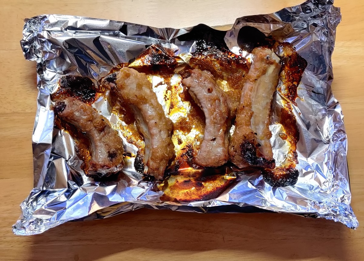 2022-06-17 豚スペアリブを玉ねぎすりおろしと焼く 豚スペアリブを買ってみる。4本税込み500円ほど レシピ https://www.kurashiru.com/recipes/3e610e90-db20-4220-9aba-5acfdc097c8e 玉ねぎすりおろしを作ってタレと絡めて寝かせてオーブンで20分焼く ビニール手袋を付けて食べる。お供はレモン炭酸水 半分くらいが骨だが、まあ良し 玉ねぎの甘さが良い 4本はちょうどいい量 2022/06/26追記 バーナーを買ったので、焼き目はバーナーに任せたほうが一様にいい感じに焦がせそう